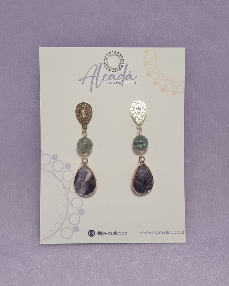 Aros Confeccionados en base bañada en oro con piedras naturales de Amatista y Labradorita.